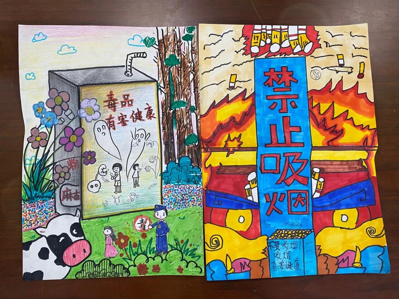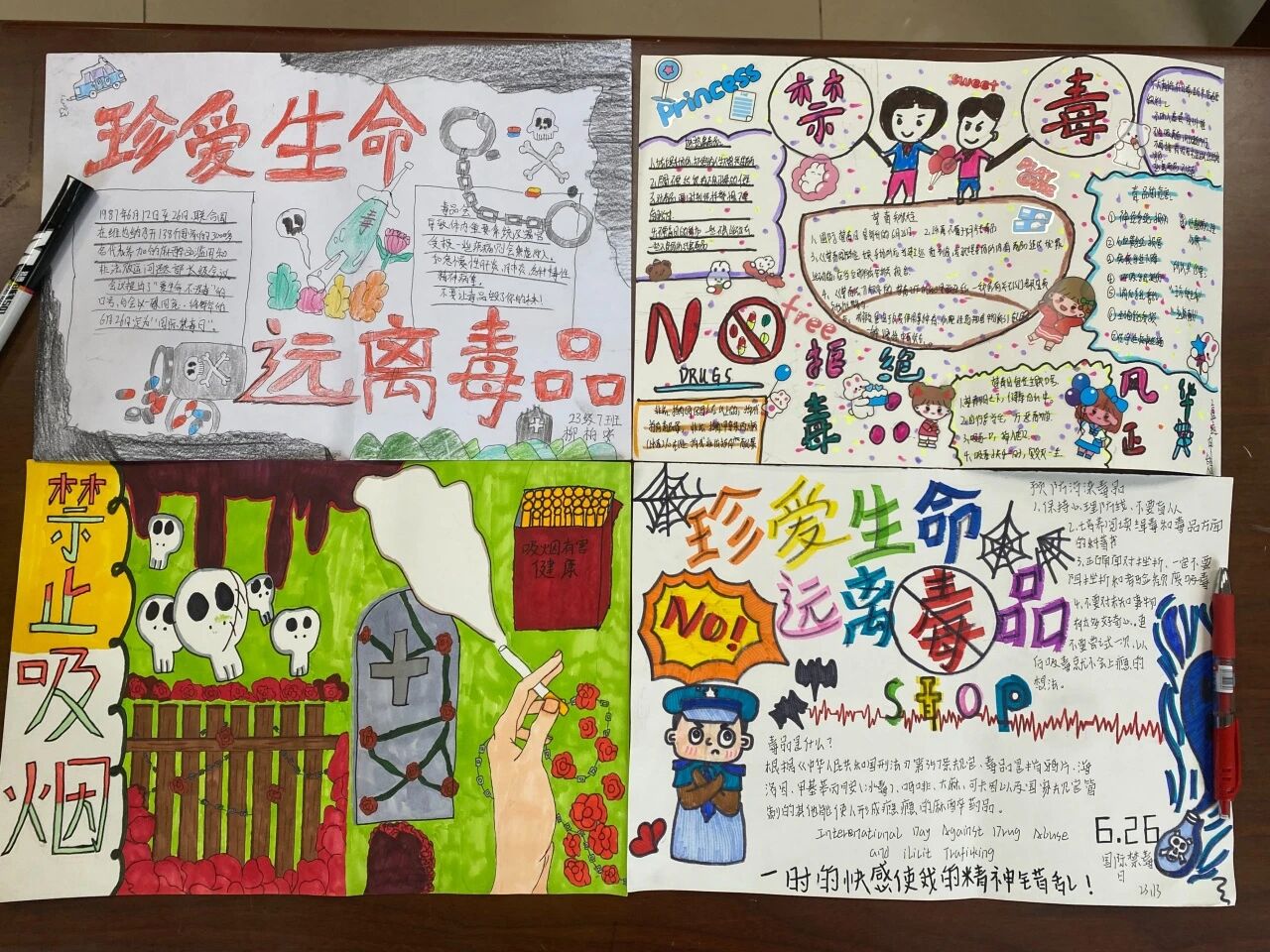 “防范药物滥用”“百年禁毒 家国有我”——同学们用50多幅文章、绘画、书法、手抄报……尽情表达禁毒决心!有对毒品危害的刻画,也有对健康未来的向往。正能量满屏,禁毒理念深入人心 。