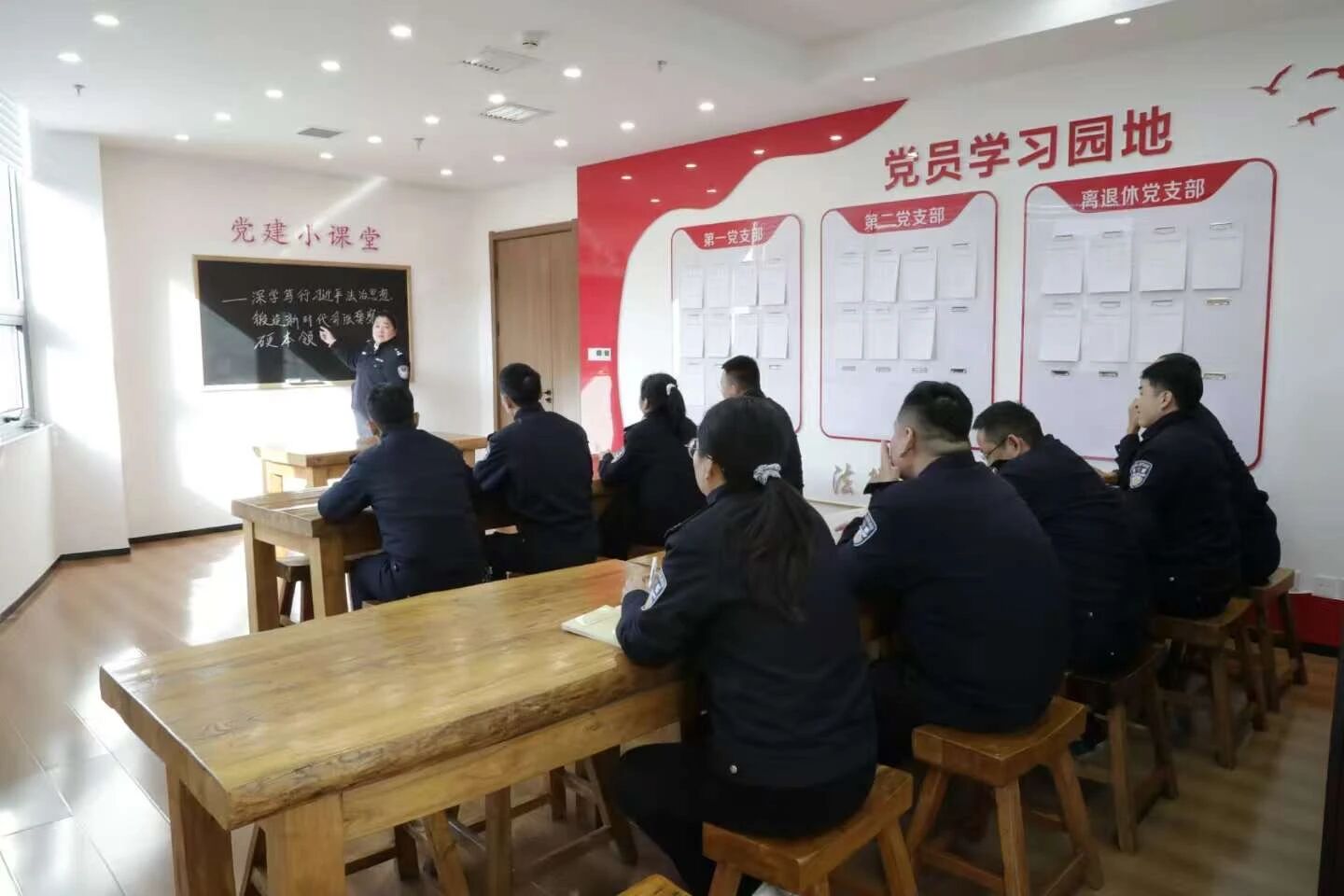 本次活动聚焦提升政治素养与凝聚发展共识,通过专题学习、风采展示与座谈交流相结合的形式,激励队伍担当作为。活动首先由大队教导员张斌丽讲授专题党课,围绕“深学笃行习近平法治思想,锻造新时代司法警察过硬本领”主题,结合司法警务实践,系统讲解核心要义,并融入纪律警示教育与先进事迹宣讲,筑牢思想根基。
